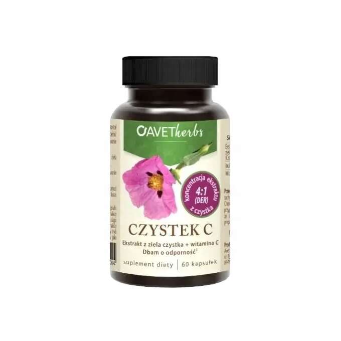 AVET HERBS CZYSTEK C Nahrungsergänzungsmittel enthält Extrakt aus dem Kraut der Purge (Cistus incanus), Inulin und Vitamin C.
