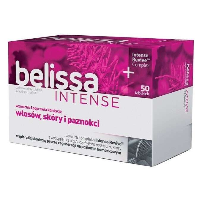 Das neue Nahrungsergänzungsmittel belissa INTENSE ist ein Produkt für Frauen, dessen Inhaltsstoffe den guten Zustand von Haaren, Haut und Nägeln unterstützen. Die bestehende Zusammensetzung von belissa wurde mit dem Intense Revive™-Komplex angereichert, dessen Inhaltsstoffe der Haut helfen, ihr Gleichgewicht zu erhalten und den physiologischen Regenerationsprozess bereits auf Zellebene zu unterstützen*.*Intense Revive-Komplex – ist eine Kombination aus Ascophyllum nodosum Algenextrakt und Vitis vinifera Traubenkernextrakt. Die Algen unterstützen den physiologischen Prozess der Zellregeneration. Außerdem helfen sie der Haut, ihr physiologisches Gleichgewicht aufrechtzuerhalten und unterstützen die Aufrechterhaltung der richtigen Hautfestigkeit und -feuchtigkeit. Traubenkerne hingegen unterstützen die Gesundheit und das Aussehen der Haut.