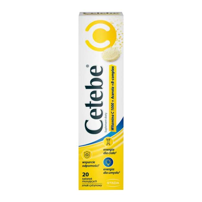 Das Nahrungsergänzungsmittel Cetebe enthält eine einzigartige Wirkstoffkombination aus Vitamin C , Acerolafruchtextrakt und einem B-Vitaminkomplex, zur täglichen Unterstützung des Immunsystems und Energie für Körper und Geist.