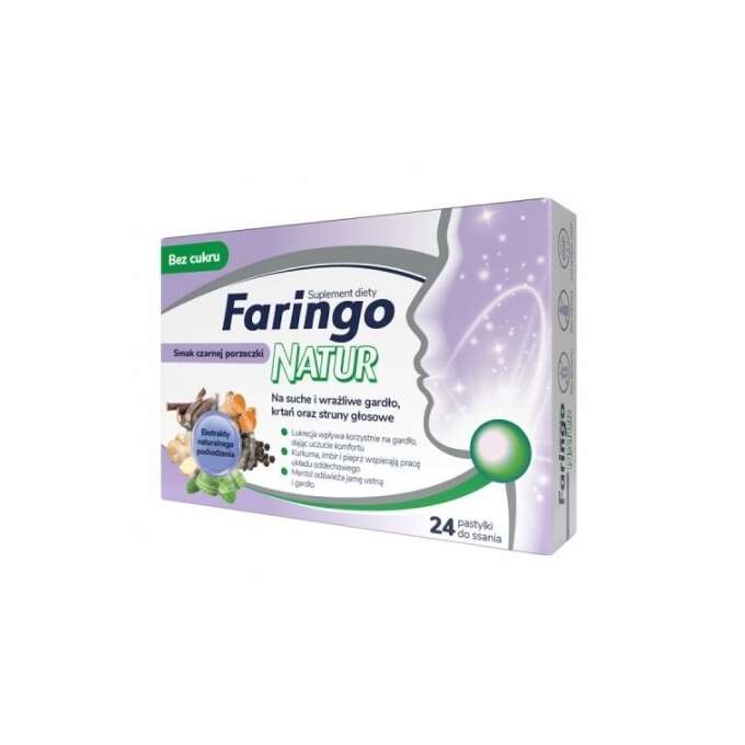 FaringoNatur, ein Nahrungsergänzungsmittel mit schwarzem Johannisbeergeschmack, enthält Süßholz, das zur Befeuchtung der Rachenschleimhaut beiträgt und eine wohltuende Wirkung auf den empfindlichen Rachen, Kehlkopf und die Stimmbänder hat. Kurkuma und schwarzer Pfeffer unterstützen das Atmungs- und Immunsystem. Darüber hinaus unterstützt das in FaringoNatur enthaltene Menthol durch seinen Inhalationseffekt die richtige Atmung und sorgt durch seine kühlenden Eigenschaften für ein angenehmes Gefühl und befeuchtet die Rachenschleimhaut.