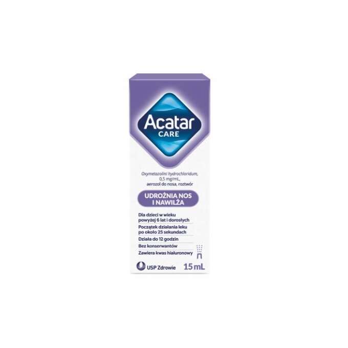 Acatar Care enthält als Wirkstoff Oxymetazolinhydrochlorid, das gefäßverengend wirkt. Die Verabreichung von Acatar Care reduziert die Schwellung der entzündeten Schleimhaut und hemmt die übermäßige Sekretion, was die freie Atmung durch die Nase erleichtert. Durch das Abschwellen der Nasenschleimhaut werden auch die Drainageröhren der Nasennebenhöhlen geöffnet und geweitet und die Ohrtrompeten entstaut. Dies erleichtert den Abtransport von Sekret und die Heilung der bakteriellen Infektion. Acatar Care verkürzt die durchschnittliche Dauer der akuten Nasenschleimhautentzündung (verstopfte Nase, Fließschnupfen, Niesen, Unwohlsein) im Vergleich zur Kochsalzlösung von 6 auf 4 Tage.