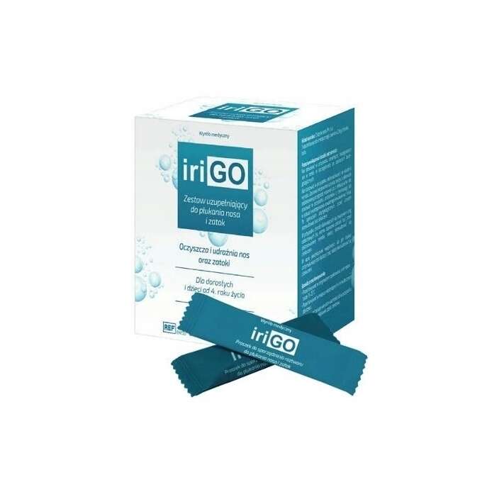 IriGo ist ein Medizinprodukt, das lösliches Natriumchlorid zur Herstellung einer isotonischen oder hypertonischen Lösung für die Nasenspülung und die Spülung der Nasennebenhöhlen enthält. Das Präparat reinigt und entstaut die Nase und die Nasennebenhöhlen, hilft, überschüssige Sekrete zu entfernen und empfiehlt Schleim, wodurch das Risiko der Ansammlung von Faktoren verringert wird, die die Bildung und Entwicklung von Infektionen in der Nase und den Nebenhöhlen fördern.