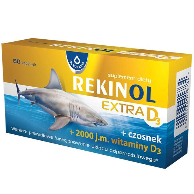 Enthält Haifischleberöl, standardisiert auf 20% Alkylglycerine. Das Präparat zeichnet sich durch einen hohen Gehalt an einfach ungesättigten Fetten, zu denen die Omega-9-Fettsäuren gehören, und einen hohen Gehalt an Omega-3-Fettsäuren aus. Der Ersatz gesättigter Fette in der Ernährung durch ungesättigte Fette trägt zur Aufrechterhaltung eines normalen Cholesterinspiegels im Blut bei [einfach und mehrfach ungesättigte Fettsäuren sind ungesättigte Fette]. Die Zusammensetzung von REKINOL extra D3 wurde mit Vitamin D und einem auf Alliin standardisierten Knoblauchölmazerat angereichert. Unterstützt die richtige Funktion des Immunsystems*