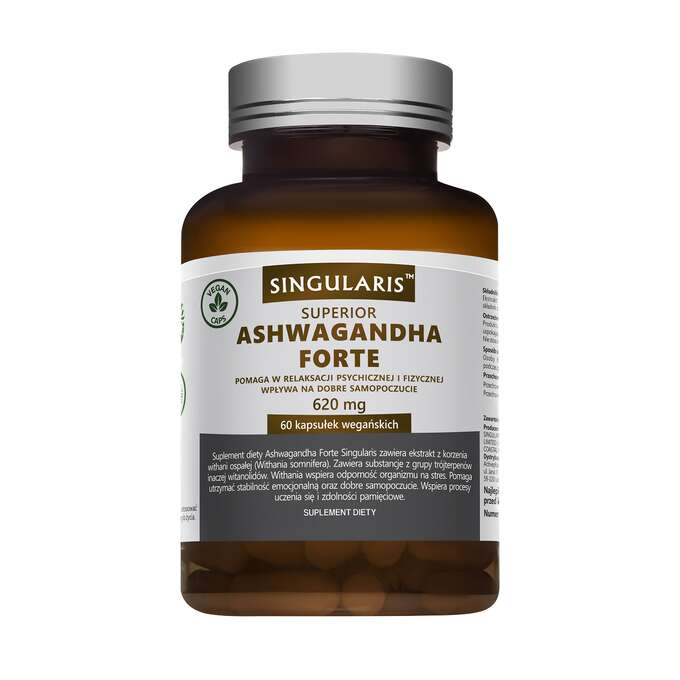 Das Nahrungsergänzungsmittel Ashwagandha Forte von Singularis enthält einen Extrakt aus der Wurzel von Withania poxana. Er enthält Substanzen aus der Gruppe der Triterpene oder Vitanolide. Withania unterstützt die Widerstandsfähigkeit des Körpers gegen Stress. Es hilft, die emotionale Stabilität und das Wohlbefinden aufrechtzuerhalten. unterstützt die Lern- und Gedächtnisfähigkeiten.