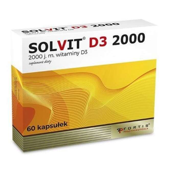Solvit D3 2000 Nahrungsergänzungsmittel mit 2000 IU.m. Vitamin D ist für Erwachsene bestimmt. Das Produkt trägt zur ordnungsgemäßen Verwertung von Kalzium und Phosphor bei, hält den normalen Kalziumspiegel im Blut aufrecht und trägt zur ordnungsgemäßen Funktion des Immun- und Skelettsystems bei.
